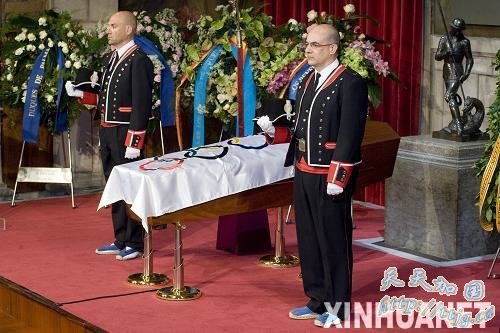 4月22日,在遗体告别仪式现场萨马兰奇的灵柩覆盖着奥林匹克会旗。当日,国际奥委会终身名誉主席萨马兰奇的遗体告别仪式在西班牙巴塞罗那举行。 新华社发 (巴克摄)