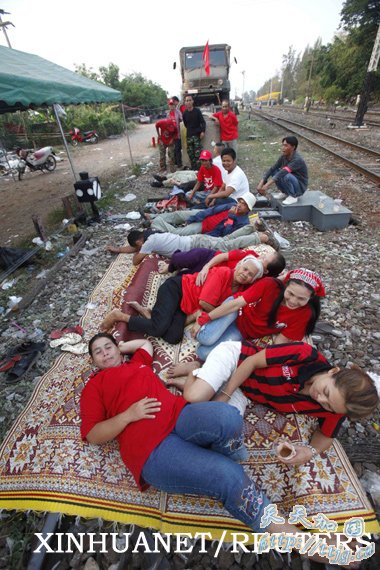“红衫军”自21日开始连续两天阻塞孔敬府通往首都曼谷的铁路,已经拦截了一列向南方运送军用物资的火车。新华社/路透 新华网曼谷4月22日电(记者史先振 张秋来)泰国总理办公室秘书长戈沙·沙帕瓦苏22日说,政府对与支持前总理他信的“红衫军”恢复对话保持乐观,因为驱散示威者不是解决问题的长久之策。 戈沙当天说,他没有放弃与“红衫军”领导人通过对话解决当前危机的努力。不过,新一轮对话形式不能与前两轮对话一样,也不会通过电视直播。他还表示,政府无意驱散示威者,“如果再次发生冲突,肯定会造成更多人员伤亡,造成相当大的影响”。 22日早些时候,处理紧急状态机构——“紧急状态公共管理中心”发言人讪森说,军队正在等待合适时机,夺回拉差巴颂地区。他敦促集会者离开这一区域回家,否则将可能遭到当局逮捕。 22日下午,在泰国东北部孔敬府阻塞通往曼谷铁路的“红衫军”同意放行一列运送军用物资的火车前往南部北大年府执行维和任务,但将派遣10名代表跟车随行。 “红衫军”自3月14日开始在曼谷持续举行反政府集会游行活动,要求解散国会下议院,重新举行选举。泰国总理阿披实与“红衫军”代表先后举行两轮谈判,但仍未就解决危机达成协议。本月早些时候,“红衫军”集中到曼谷市中心商业区拉差巴颂路口,并一度威胁要到金融街是隆路集会。