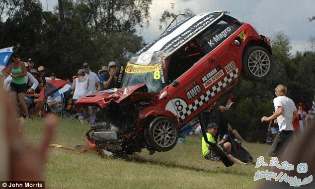 驾驶这辆赛车的车手,今年22岁的凯恩·马格罗在事故发生前正要超过另一名车手,结果赛车与另一辆车发生碰撞,突然失控,翻滚着飞向旁边的观众区,观众四散逃命。两名60岁左右的男子头部受伤,被送往医院救治。凯恩·马格罗毫发未伤,自己从撞烂的赛车里走出来。澳大利亚传奇赛车手迪克·约翰逊说:“没有几个人受重伤真是奇迹。”