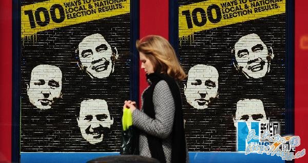5月4日,在英国首都伦敦,一名女子从印有英国三大主要政党领袖头像的广告前经过(上为现任首相、工党领袖布朗,左为保守党领袖卡梅伦,下为自由民主党领袖克莱格)。最近的一系列民调显示,三大政党民意支持率的差距为4%至9%,选情呈胶着态势。一些分析人士据此认为,英国在大选后很可能出现“无多数议会”,即没有一个政党成为议会多数党的状况。新华社记者曾毅摄