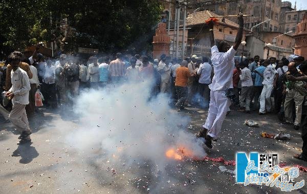 5月6日,人们在曾经发生恐怖袭击的印度孟买CST火车站外燃放鞭炮,庆祝袭击案罪犯卡萨布被判死刑。新华社/法新
