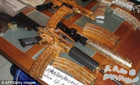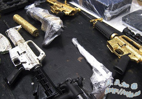 据《每日邮报》报道,墨西哥警方近日在突袭一个黑帮头目的住所时,意外缴获了一批镶满金银宝石的枪支,这些“豪华”的武器为大家展示了大毒枭们怎样挥霍他们的不义之财。