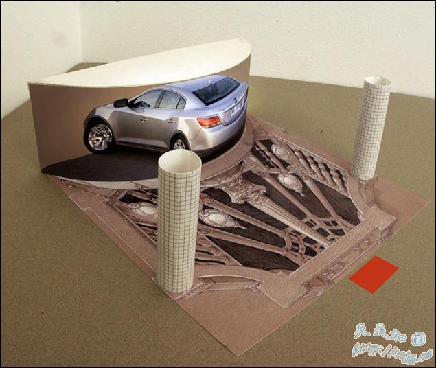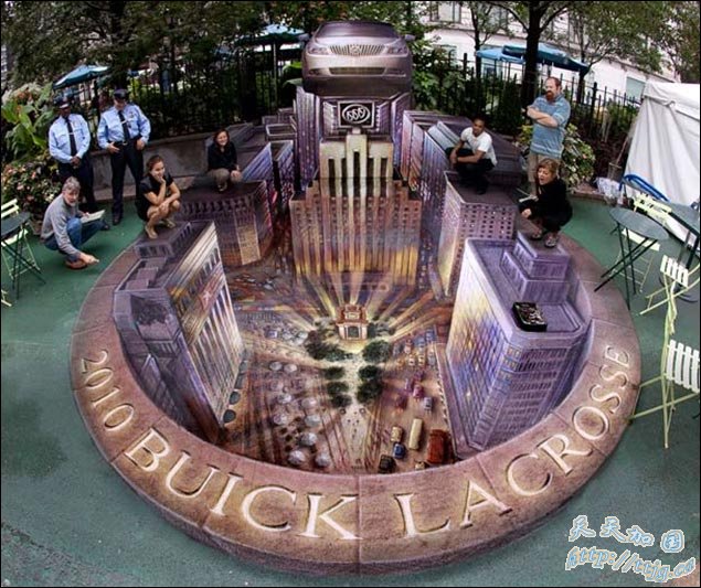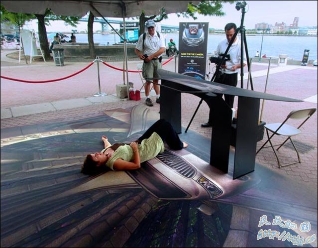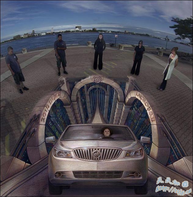 该作品是为美国费城别克汽车公司制作的。参与者可以躺在地上拍照,拍出来的效果就仿佛参与者是在车里一样。