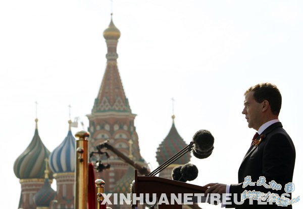 5月9日,在俄罗斯首都莫斯科,俄罗斯总统梅德韦杰夫在纪念卫国战争胜利65周年阅兵式开始前发表讲话。俄罗斯当日举行阅兵式,纪念卫国战争胜利65周年。 新华社/路透 背景资料:5月9 日--战胜德国法西斯纪念日