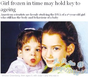 据英国媒体9日报道,美国女孩布鲁克·格林伯格尽管已17岁大,但她的外表和举止看上去仍然如同一岁女婴,她的体重只有7.25公斤,身高也只有0.76米,至今仍然只会牙牙学语!据悉,本周,多名世界著名的衰老学研究专家将出席伦敦皇家学会举办的会议,共同探讨布鲁克的“不老之谜”。