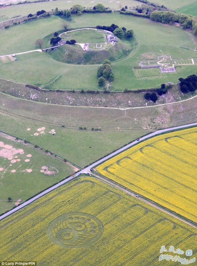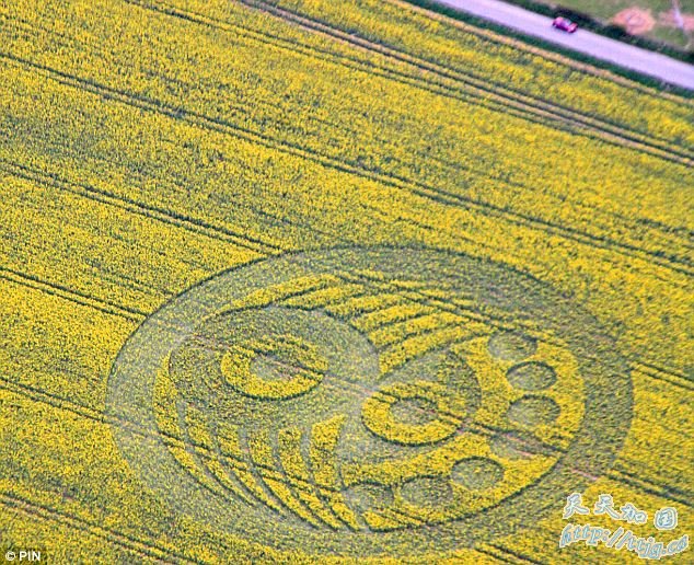 据《每日邮报》报道,在英格兰南部威尔特郡有一座铁器时代的要塞,日前在这附近的一片油菜地中发现了今年第一例麦田怪圈。据悉,这个地方经常出现麦田怪圈现象,去年在索尔兹伯里市附近的一片田地中就出现了一块45.72米长的蜻蜓外型怪圈。