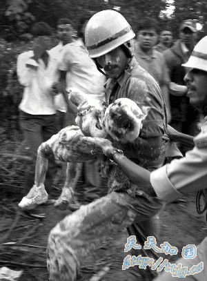 22日,印度,消防人员从客机残骸中救出一名受伤男孩。