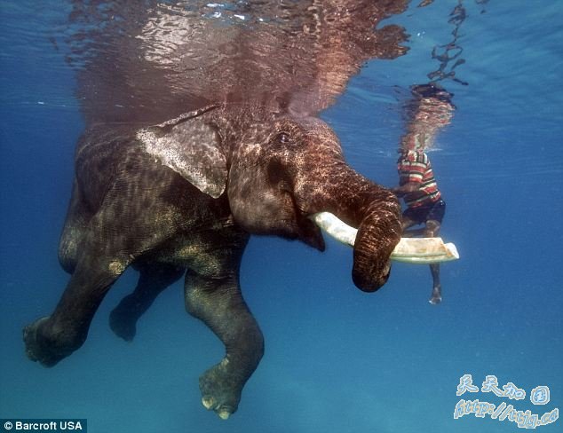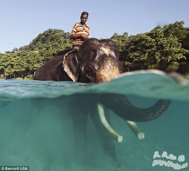 照片上的老象罗占(Rajan)已经60岁了,和主人一起生活在印度洋孟加拉湾附近的小岛上。罗占虽然年事已高,泳技却十分出色,近4米高、3.5吨重的庞大身躯在清澈的海水中显得优雅而从容,与58岁的老赶象人构成一幅幅和谐美丽的画面。
