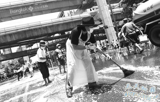 5月23日,人们已经在曼谷街头开始进行清扫工作 延长宵禁巩固胜利成果 【英国《每日电讯报》5月23日】泰国总理阿披实今天宣布,在曼谷和其他部分省份实施的夜间宵禁将延长2天,即23日和24日夜间。 自曼谷爆发暴乱以来,泰国国防部长巴维·翁素万5月19日下午宣布将在曼谷实施宵禁,以防止局势进一步恶化。 【香港《大公报》5月22日】曼谷目前总体平静,市民纷纷外出,逐渐恢复正常生活,多个政府部门派出工作人员到市中心街道进行清理,收拾前几天暴力冲突遗留下来的残局。 泰国总理阿披实发表全国电视讲话说,当局会继续推动和解计划,与“红衫军”建立沟通渠道。同一天,泰国财政部长称若局势稳定,政府有可能会提前举行大选。 5月21日早上,泰国军队和民众开始对除拉差巴颂地区以外的“红衫军”集会地区的街道进行清扫,拆除路障。 和解进程决定选举日期 【英国广播公司5月21日】泰国总理阿披实承认政府还面临巨大挑战,尤其是严重的阶级对立。在军队清场时,曼谷街头爆发了激烈枪战和大范围的纵火袭击。 【路透社5月22日】泰国政府今天强调,将继续推动民族和解,但表示不会承诺按照“红衫军”抗议者要求的日期提前举行选举。 泰国总理阿披实昨天(21日)在一次电视讲话中强调了和解计划,但他并未提到自己在本月初为和平结束抗议活动而提议在11月举行选举一事。泰国政府发言人巴尼今天说:“他(阿披实)并没有排除提前举行选举的可能性。这取决于我们在和解路线图方面取得的进展。” 老百姓仍然没有安全感 【德国之声5月23日】随着曼谷市中心地区清理工作的进行,随着“红衫军”最后一批路障被清除,人们对暴力示威者在解除宵禁后会不会重新返回,越来越感到担忧。曼谷的一位居民说,她不相信整个事件就这么过去了。她担心还有些示威者藏匿在当地,尤其是“黑衣人”。这些人没有被全部逮捕。 蓬泰普是一家咖啡店的店主。他的店就在拉亚普拉松十字路口不远的地方。他说,他对面的一家店铺被人放火烧毁了,所幸他自己的小店没有遭到洗劫。但政府士兵撤离后情况会怎么样,他很难推测,他担心戒严令解除后,抢劫的人还会回来。 一位居民说,她看到一队在市中心打斗后骑着摩托车呼啸而来的流氓。这些人来了之后就肆意放火。德国之声记者发现,曼谷街上的许多人都不敢敞开讲话,不敢说他们所经历和看到的一切。 【新加坡《联合早报》5月23日】泰国“红衫军”占据了两个月的曼谷市区终于恢复平静,但这个微笑的国度却已严重受创。 曼谷共有39个地点遭到纵火,其中包括一些世界级商场。曼谷市长说,道路可以立即修补,民众受伤的心灵却不知要多久才能修复。这条重建的道路,相信泰国会走得很艰苦。