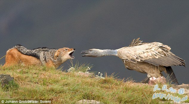 当豺狼现身于山脊后,对于秃鹰没有因其的出现而吓到感到恼火。为将秃鹰成为盘中美餐,豺狼依然使用传统的狩猎习惯,先慢慢靠近后慢慢后退,观察周围环境,并准备做出致命一击。但秃鹰仅站在原地冷眼观察豺狼的举动。 据《每日邮报》报道,居住在南非行政首都比勒陀利亚野生动物摄影爱好者里瑞特(Lizet)及约翰?格洛贝拉尔(Johann Grobbelaar)夫妇近日在南非当地夸祖鲁--纳塔尔巨人城堡野生动物保护区内拍摄到一组极为罕见的“豺狼与秃鹰争斗现场”照片。 作为陆地和空中的两种食肉动物物种,豺狼和秃鹰相遇时都把对方作为填报肚皮的美餐。体型较大的豺狼显然把秃鹰当作嘴到擒来的猎物,但没想到秃鹰也将对方视为美食。由此双方展开了一场别开生面的战斗。 现年40岁的约翰称:“尽管我们经常拍摄大自然野生动物照片,但能拍摄到这种陆地和空中动物物种搏斗场面的机会极为罕见。当我们看到豺狼和秃鹰互相注视对方时,我们预感到这场战斗将为我们提供绝佳的摄影素材。在整个过程中,我们最感到兴奋的是,能拍摄到秃鹰突击啄豺狼鼻子的一幕。”