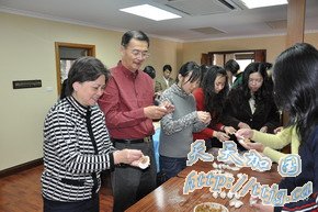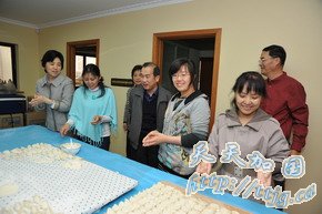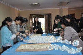 活动的第二站是文化处,大家在这里包饺子、搞联欢,更是热闹。在公使衔文化参赞柯亚沙的带领下,文化处全体总动员,布置场所、烹制凉菜,为大家准备了拍黄瓜、拌木耳和瓜果、调试音响,准备乒乓球拍,做足了准备。大家一下车便冲进厨房,有的和面、有的擀皮、有的包馅,既有分工,又有合作,忙得不亦乐乎。大家边做边聊,笑声阵阵,欢乐开怀。