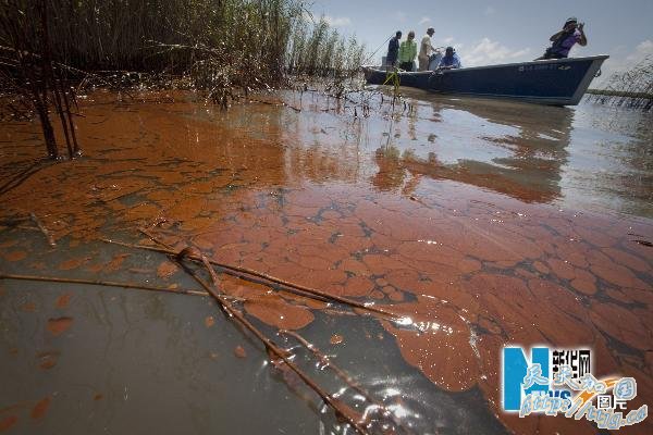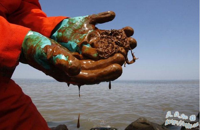 英国《每日电讯报》披露了一组墨西哥湾漏油污染状况的图片。粘稠的褐色液体、全身都被浸湿的海鸟,着实让人触目惊心。图为戴着手套的“绿色和平”组织海洋生物专家保罗·霍斯曼,展示一截被石油浸染的绳子。粘稠的褐色液体,让人瞠目结舌。(图片来源:国际在线)