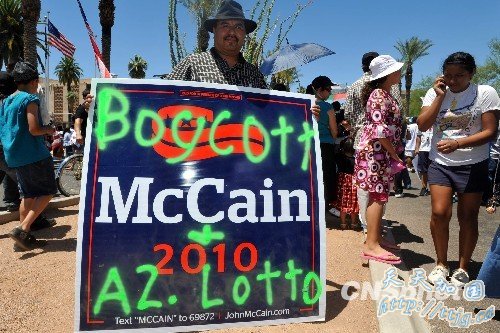 当地时间5月29日,数万名抗议者在美国亚利桑那州凤凰城举行声势浩大的游行示威活动,抗议亚利桑那州通过全美最严苛的反非法移民法案,两个月后,该法案将正式生效。这是该法案通过以来,凤凰城举行的最大规模的抗议游行。图为抗议者呼吁抵制联邦参议员麦凯恩。麦凯恩是该法案的坚定支持者。 中新社发 张炜 摄