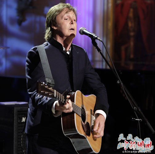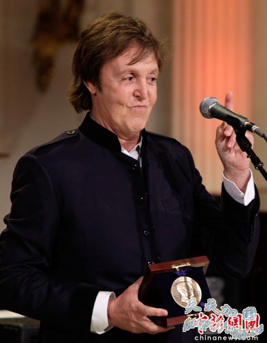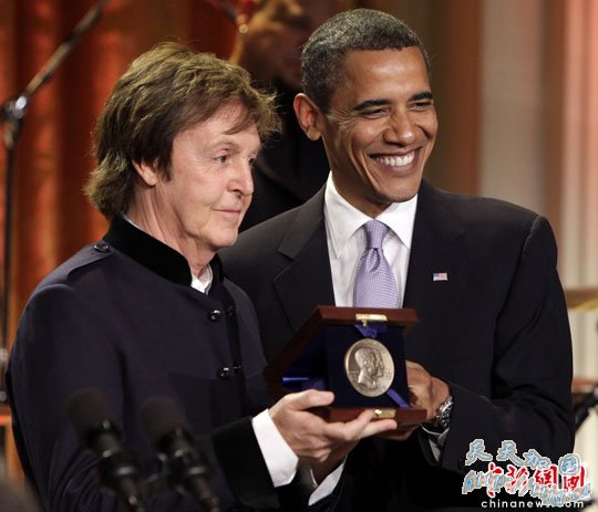 图为美国总统奥巴马为前披头士成员麦卡特尼颁奖。