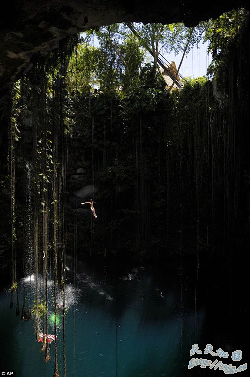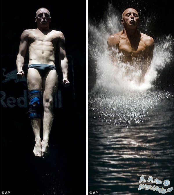 据《每日邮报》报道,上周日在墨西哥一处天然落水洞举行的红牛悬崖跳水世界系列赛上,摄影师抓拍到的一组照片展示了运动员纵身跳下27米深的地下洞穴的精彩瞬间。