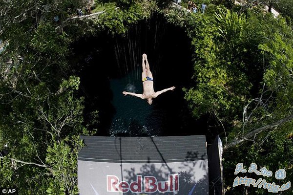 本年度的红牛悬崖跳水世界系列赛最后一轮赛事在位于墨西哥犹加敦半岛的森诺依其尔自然公园举行。比赛进行时,运动员从阳光明媚的地面跳进阴暗的地下洞穴,以60多千米的时速落入洞中的湖水里,场面壮观而又刺激。