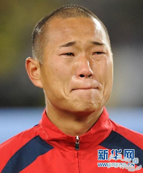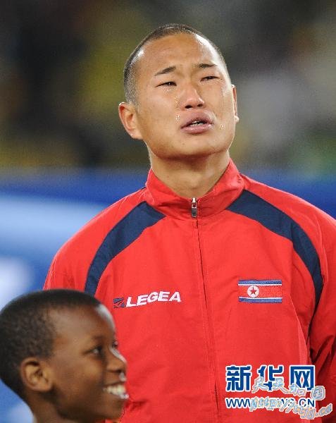 6月15日,朝鲜队球员郑大世在奏朝鲜国歌时泪流满面。当日,在2010南非世界杯小组赛G组比赛中,朝鲜队对阵巴西队。 新华社记者李尕摄