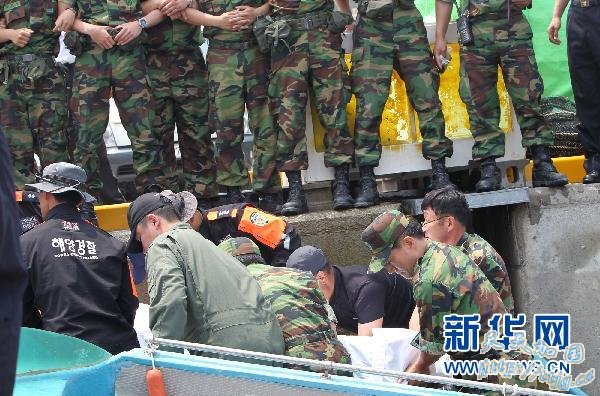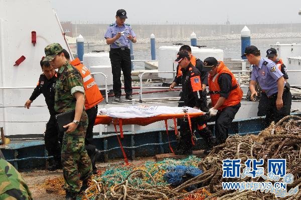 6月18日,在韩国江陵附近东海海域,救援人员在搬运一具遇难飞行员的尸体。新华社/联合通讯社