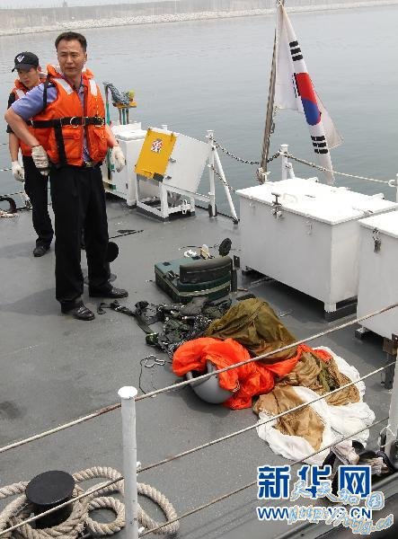 6月18日,在韩国江陵附近东海海域,救援人员将遇难飞行员逃生时使用的降落伞和头盔等装备运回。新华社/联合通讯社