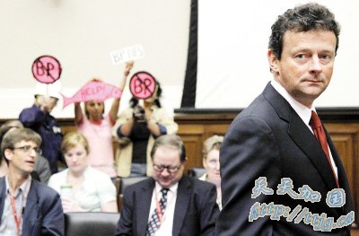 17日,BP首席执行官托尼·海沃德(右)在出席美国国会听证会时遭遇抗议。