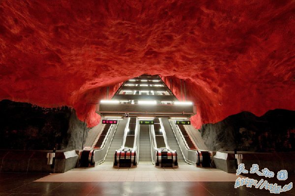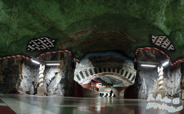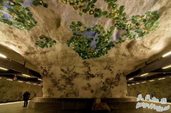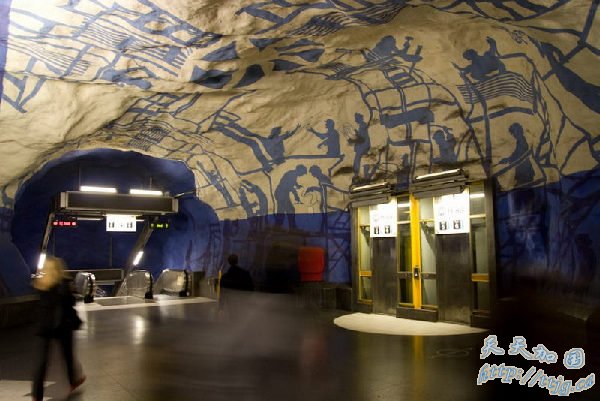 斯德哥尔摩地铁的几个站是在岩石中凿开出来的,留有洞穴状的“天花板”。它是古代和未来的结合。洞穴绘画是其点睛之笔。在其100个地铁车站中,有一半以上装饰着不同的艺术品,它们表现着不同的主题,给斯德哥尔摩地铁增添了生机勃勃的活力和憧憬。