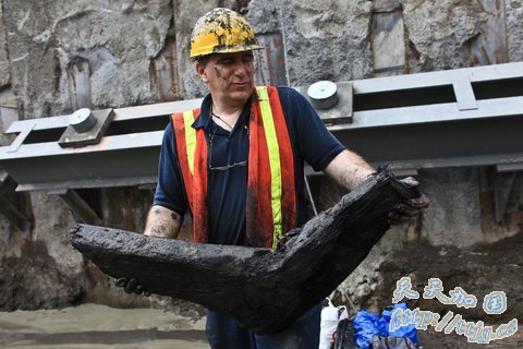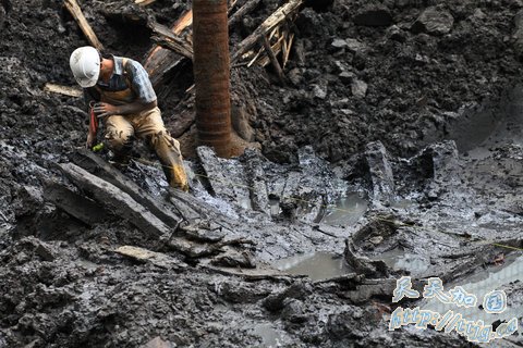 2010年7月14日,纽约,在美国世贸中心遗址,考古学家正在挖掘一艘大概在18世纪晚期或者19世纪早期时候的船只。该船是在近日的一次建筑挖掘时发现的,据称已经在地下“沉睡”100多年。