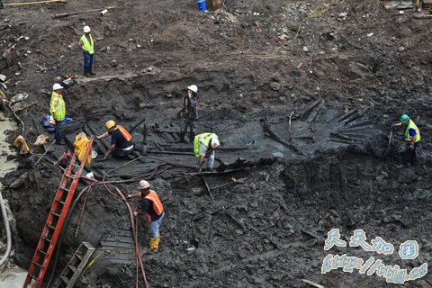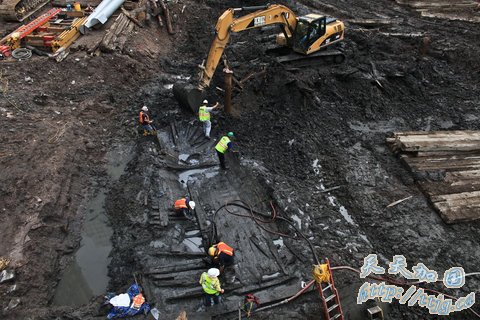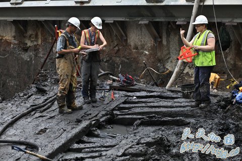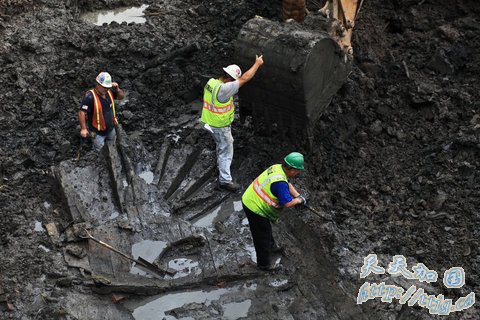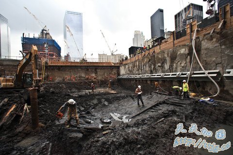 据纽约时报报道,2010年 7月14日,纽约,在美国世贸中心遗址,考古学家正在挖掘一艘大概在18世纪晚期或者19世纪早期时候的船只。该船是在近日的一次建筑挖掘时发现的,据称已经在地下“沉睡”100多年。