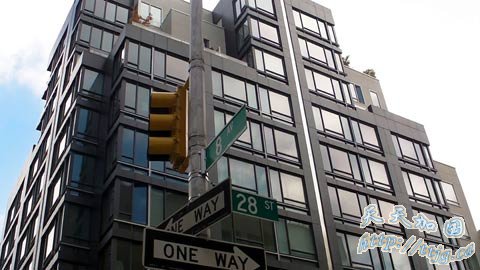 扁家在5楼边间,一边靠第八大道,一边靠西28街,大厦门口在西28街上。西28街是一条只有一线的单行道,第八大道则车水马龙,地面层楼正在装璜出租做为商店。大厦的一楼大厅不大,但墙上的浮雕凸显非凡气质。