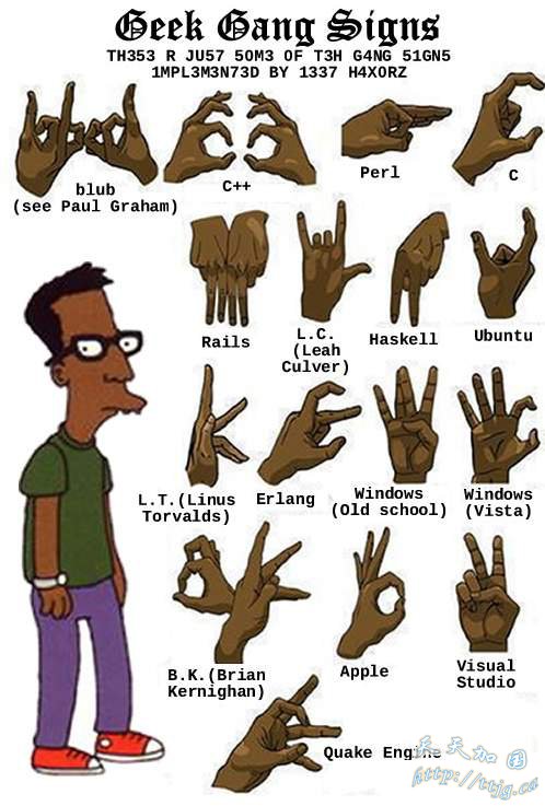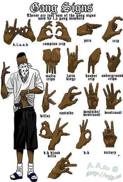此图和上图一些最常见的美国街头黑帮手势语。每个手势代表一种黑帮,如果你不小心向A黑帮做了B黑帮的手势,结果会不堪设想。强奸、虐杀、谋杀等等。