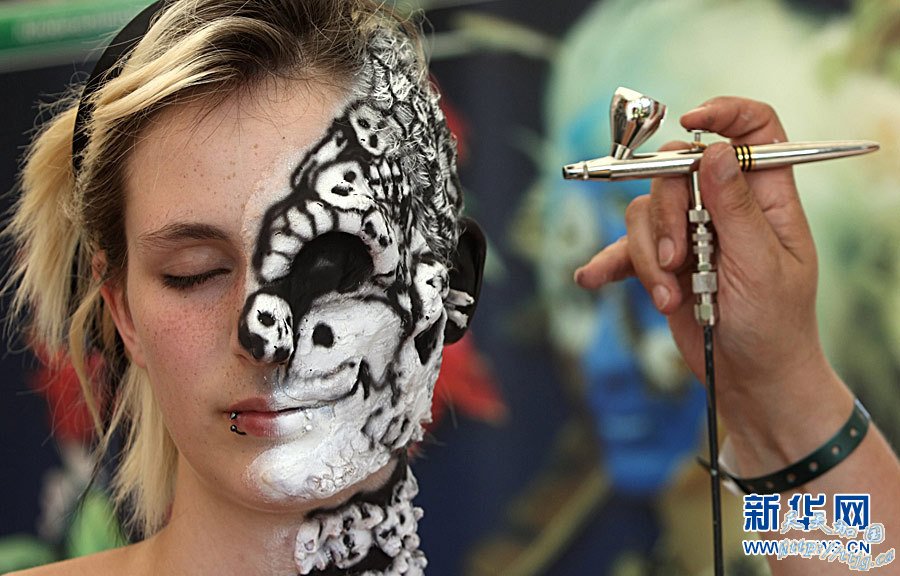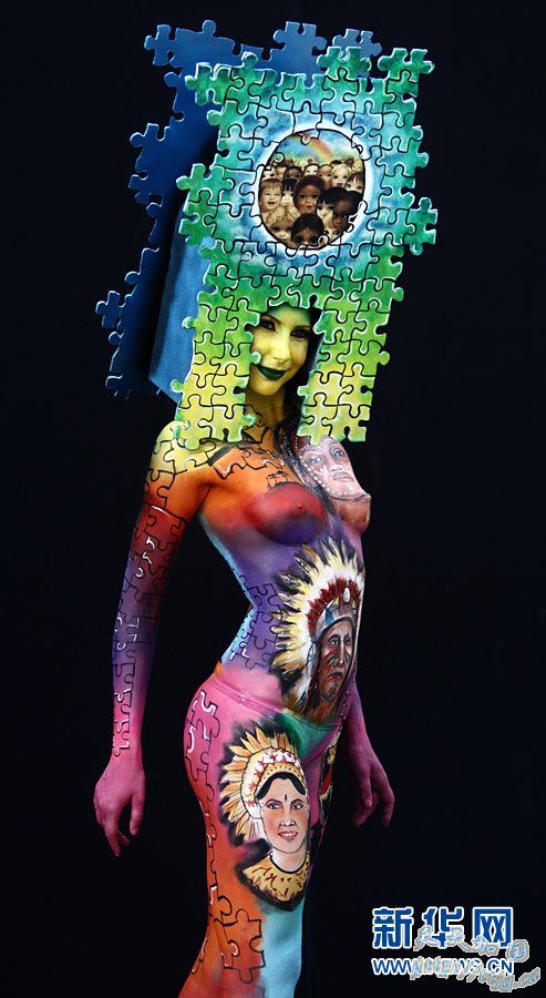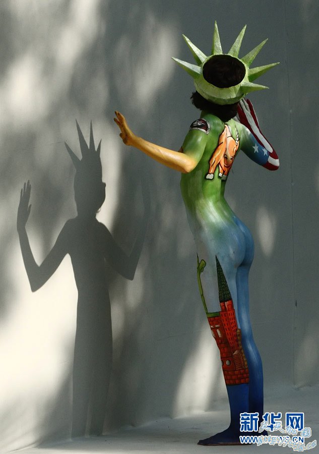 7月16日,在奥地利南部卡林西亚州的塞博登,艺术家在模特身上进行彩绘创作。当天,每年一度的世界人体彩绘节在赛博登开幕。本届彩绘节将持续至18日。