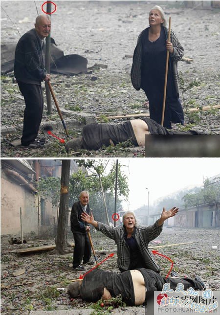 路透社给这幅照片的标题是《在哥里市,格鲁吉亚人站在他们儿子的身体旁边》。这个妇人仰望天空,她的儿子可能已经死了。但是照片中儿子的身体明显被从路缘边移动了一段距离。这样做显然不是为了掩盖死者身体的裸露部分,也不是为了让死者更有尊严。难道是为了有更好的光线角度,以利于拍摄吗?