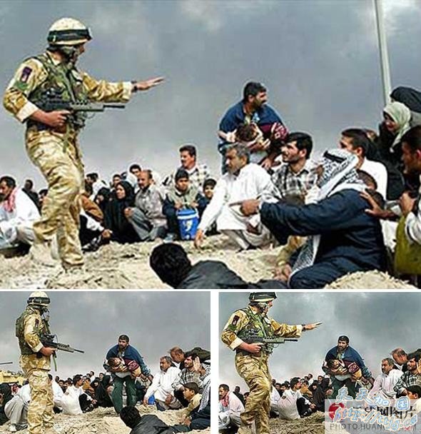 2003年,拍摄这张英国士兵帮助伊拉克平民隐蔽的是从事新闻工作30年的洛杉矶时报记者布莱恩·瓦尔斯基。该照片刊登后瓦尔斯基即被解雇,因为报社主编发现这张照片是由两张不同照片拼接而成。