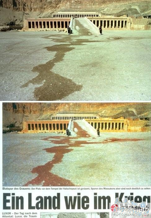 瑞士媒体《Blick》报在报道埃及1997年11月发生的外国游客遭枪击事件所刊登图片,图片将水迹改为红色以营造恐怖效果。