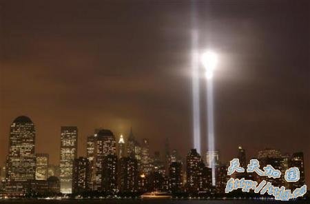 2007年9月11日,世贸大厦遗址亮起激光灯束,纪念“9·11”恐怖袭击事件六周年。