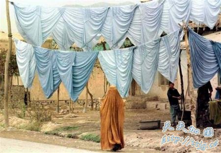 塔利班政权统治下的阿富汗喀布尔,一名女子蒙面经过一家服装店。塔利班武装于1996年夺取政权开始实行严格的伊斯兰教法,禁止妇女露面。