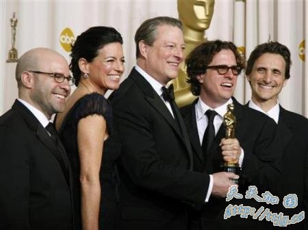 2007年诺贝尔和平奖授予美国前副总统戈尔和联合国的政府间气候变化专业委员会。(2007年2月25日,美国好莱坞,环保纪录片《难以忽视的真相》获得第79节奥斯卡奖,制作人员斯科特·伯恩斯(左)、前副总统戈尔(中)留影。)