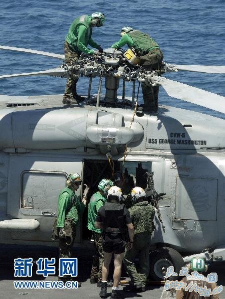 7月26日,美国海军“乔治·华盛顿”号航母上的机械师检查一架直升飞机。韩国和美国联合海上军事演习当日进入第二天。韩国军方官员说,当天演习重点为反潜。