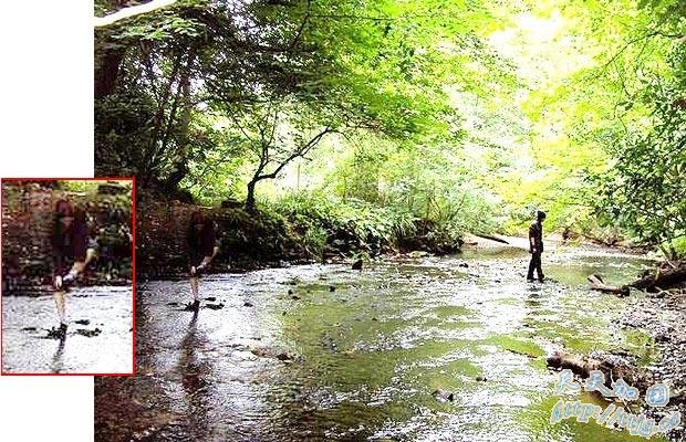 一位带着黑色头巾的神秘人影站在水边。怀疑者认为这个人影是对面岩石在水中的投影造成的。