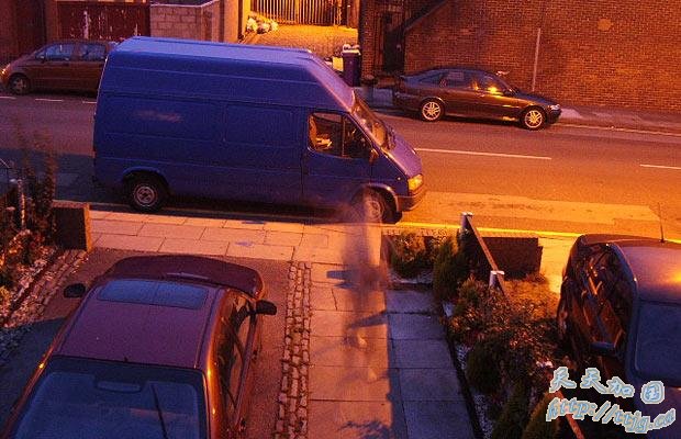 这张照片上,可以看到一个鬼影正在沿着小巷行走。但怀疑者称,这可能是曝光时间过长造成的。