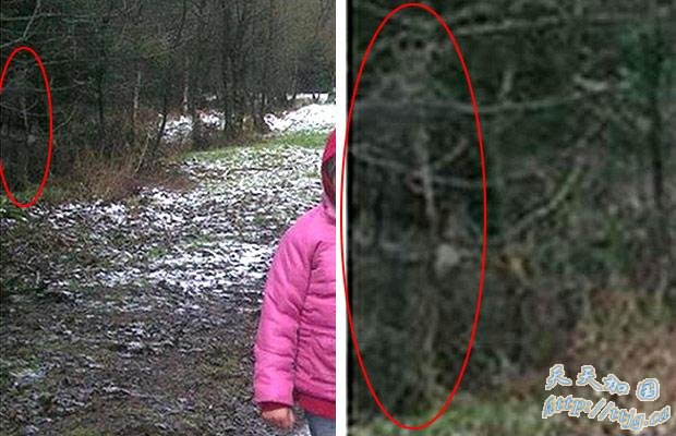 摄影师带着孩子和狗旅游,照片中的树林中有一张怪异的人影。怀疑者们认定,这个人影显然是树叶和树枝的阴影混合成的。