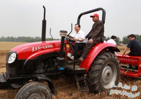 6月10日,在河南省许昌县陈曹乡后孙汪村高产小麦示范区,温家宝登上一台“东方红”牌拖拉机的驾驶室,在司机指导下驾驶,在刚刚收割的麦地里耕种秋玉米。