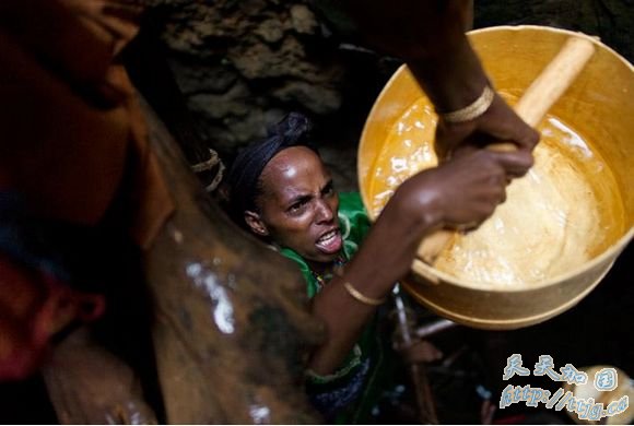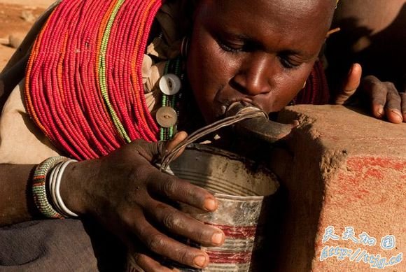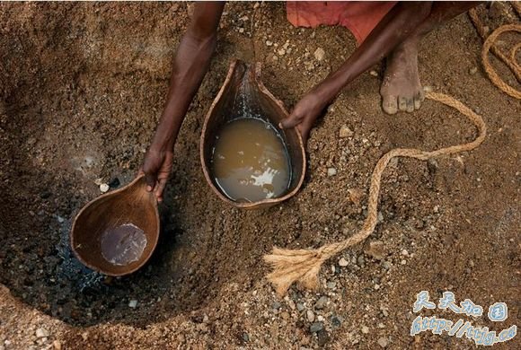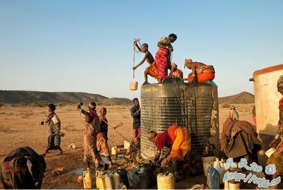 肯尼亚北部Marsabit地区。这是一口九人深的水井,妇女们在溜滑的简易梯子上竭力保持平衡,手把手向上传递几加仑珍贵的井水。水送出井口后,妇女们还要提防它被口渴的牲畜喝光。