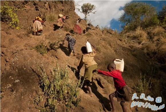 埃塞俄比亚,Foro村外的山间小路。一群孩子扛着用于日常饮食的浑浊河水,在通往他们村子的陡峭山路上攀爬。他们每天往返几趟,一个来回要用两三个小时。男孩子到了七八岁就可以解脱这样的劳役,而女性则终其一生的大部分时间都得不停地背水。