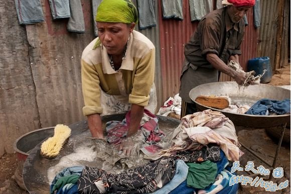 在亚的斯亚贝巴贫民窟的一个街边洗衣作坊里,Muntaha Umer在那里用污水洗男士的衣服,每天只能获得一美元的报酬——只有男人能负担得起这一美元的费用。