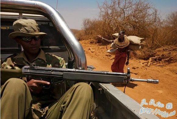 一条中国援建的联接肯尼亚和埃塞俄比亚的公路。一辆由武装人员押运的卡车驶过一位虚弱得几乎背不动牲畜草料的女性。自从一位中国工程师被愤怒的当地人打死,政府提高了这片饱受干旱困扰地区的安防等级。
