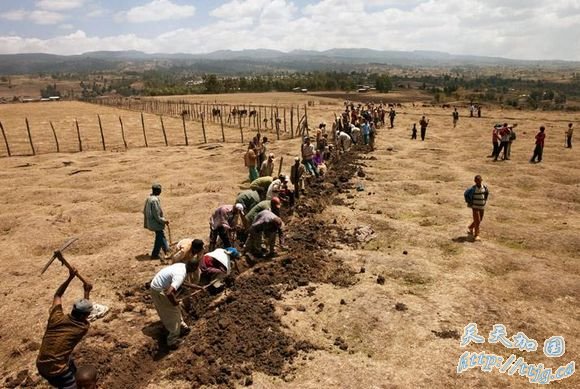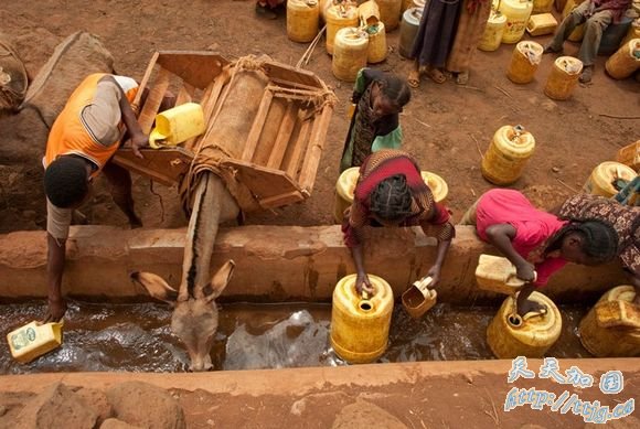 埃塞俄比亚Arayo河。每逢旱季,河床里就只能渗出来一点泥浆了,妇女们只好“刮”水出来。不过拜上游新建的砂坝所赐,只要下场雨,地下蓄水池就能蓄起雨水,届时只需用手压泵就能得到干净的用水了。