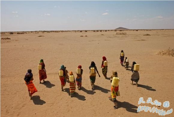 肯尼亚北部Gabra地区。当地妇女每天要背负沉重的水罐和不洁的浑水跋涉五个小时。持续的旱情使这个原本就干旱的地区出现了严重的水荒。