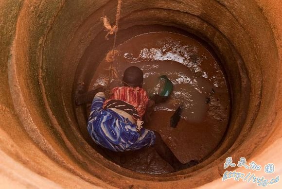 坦桑尼亚Matumburu村。一个小姑娘双脚撑住井壁,舀取浑浊的井水。排了十个小时的队以后才轮到她取水,而且还得继续等——等井里渗出足够的水,也就是说,下一位还要再等将近一个小时才能被轮到。