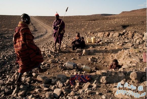 肯尼亚,马萨比特附近的村民和毛驴都将身体探入“歌唱水渠”上游的水槽中——之所以叫“歌唱水渠”是因为把深层地下水提上来的那些村民在干活时会边唱歌边干活。在这里,每位游客每天允许灌满一个大的简便油桶——而妇女则通常需要等到动物都饮足水之后才能灌水。