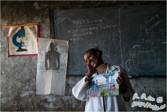如果数百万为了用水而疲于奔波的妇女能有一只安装在家门口的水龙头,那么整个社会都将变得大不相同。埃塞俄比亚Ticho镇附近的一堂卫生课。 教师Hiruut Nigusee笑着展示一幅排便的图画。起初学生们有些尴尬,但现在他们已养成使用旱厕和洗手的习惯,得痢疾的人越来越少。